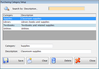 This is for setting up optional categories that may be used for identifying different types of vendors. Once a Purchasing Category is set up, you can use it to indicate in Vendor Setup that the Vendor qualifies for under this category.