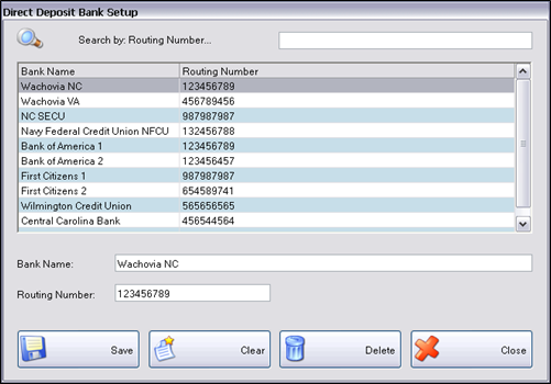 Direct Deposit Bank Setup sets up the Employees’ direct deposit banks. Direct Deposit Banks must be set up here before they can be selected on the Employee’s Personal tab.