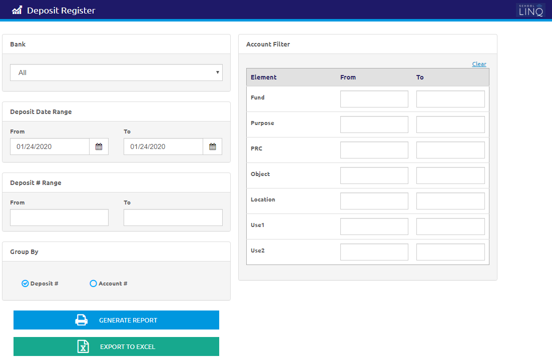 • Enter a Deposit # Range in the From and To fields. This is optional.